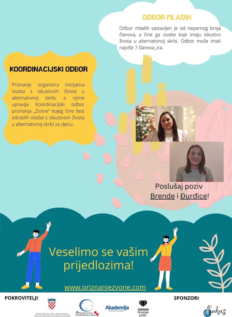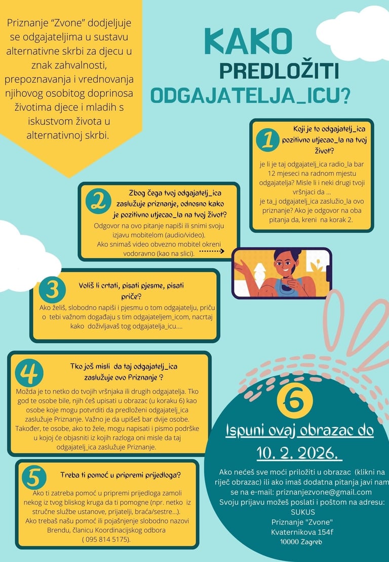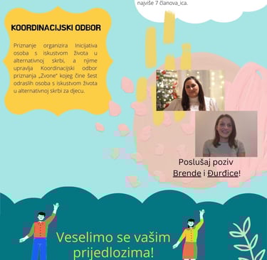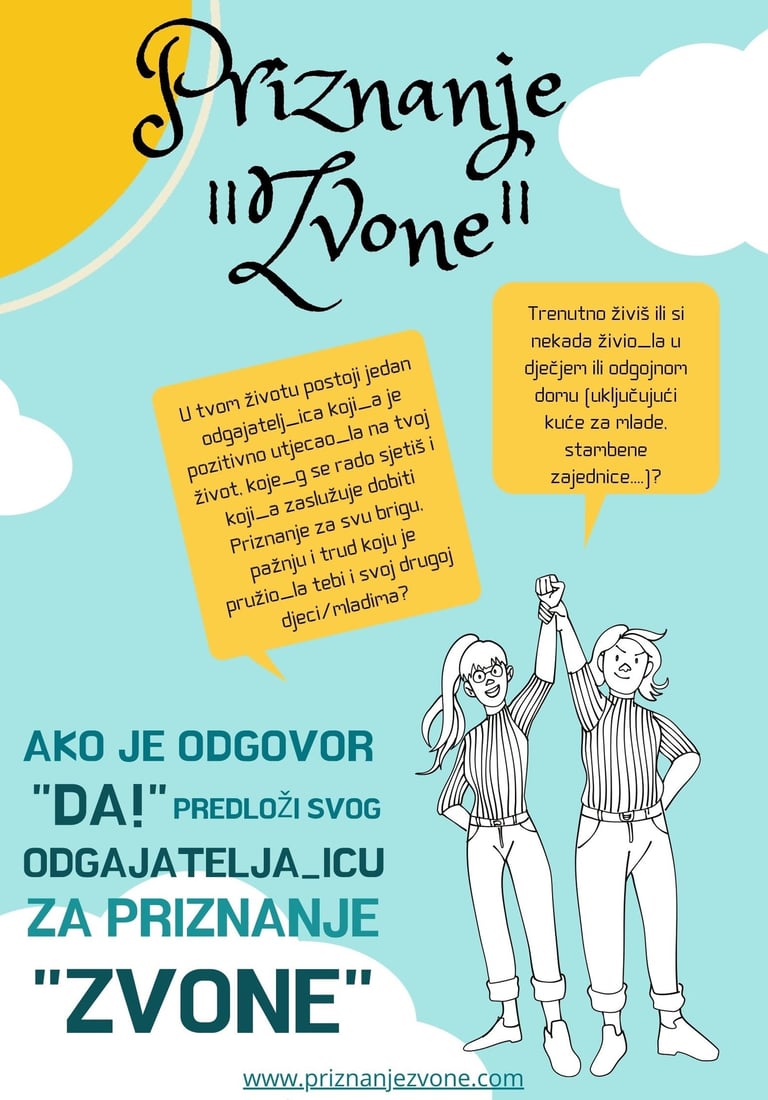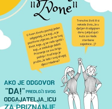 Ovim javnim pozivom pozivaju se svi sadašnji i bivši korisnici sustava alternativne skrbi za djecu da predlože odgajatelje_ice za dobivanje priznanja “Zvone”.